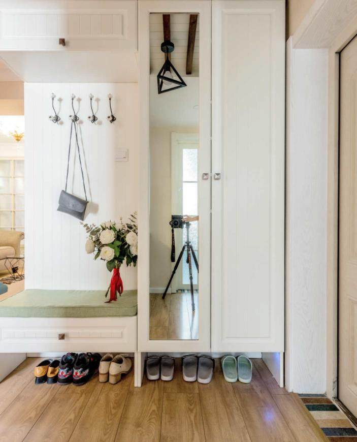 因为这个家面积没很大,所以塔塔大量运用了定制的家具,玄关也是,顶天立地的鞋柜+换鞋凳设计,收纳面积足,也不积灰,以后打扫起来也方便。