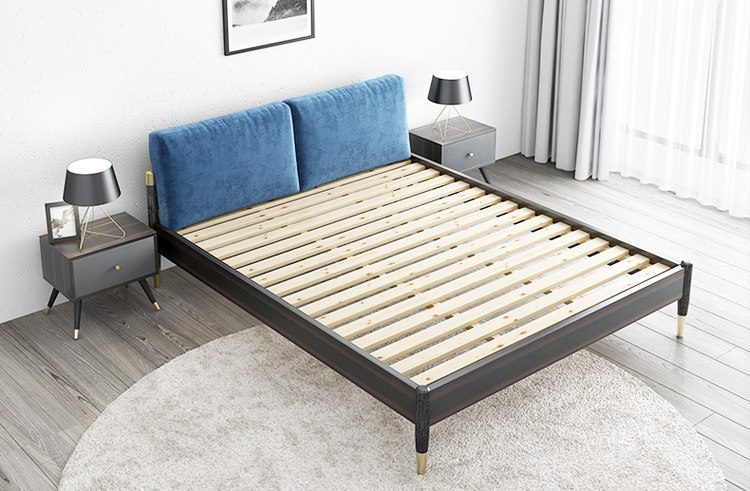 蓝色绒质感布艺的软靠,简洁四方形,饱满厚实,简约美观,高密度海绵填充回弹性好,倚靠舒适。。床头、床尾与床侧板则采有实木板材,免漆板材质坚硬,木纹清晰漂亮,床体架构稳固。而床腿则采用白蜡木,圆柱小圆锥形,下端描金色油漆,承重力强,床板条为松木,自然清新。