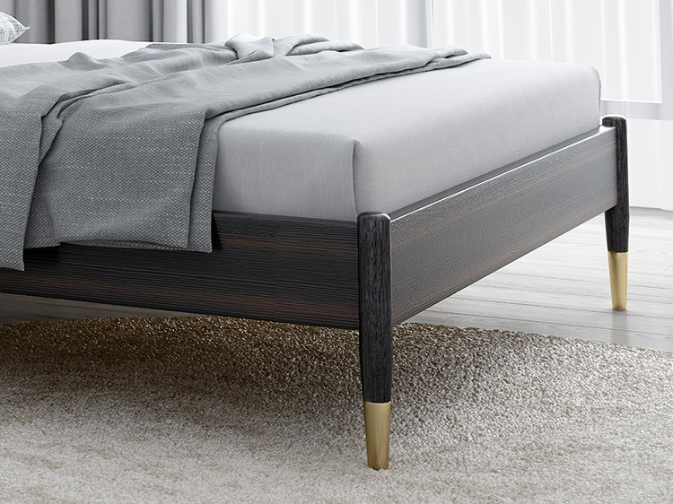 时尚轻盈的外型,有着北欧风经典的简约,床侧板和床尾均采用深色木纹的实木拼板板材,加厚加宽牢固耐用,纹理清晰。简洁美观的床尾,四个锥形全实木床脚,在脚部采用金色手描油漆,色彩饱满亮丽,与深色木纹搭配,增添了时尚亮点,轻奢吸睛。同时合适的床底高度,坐在床边舒适,床底下也方便清洁打扫。