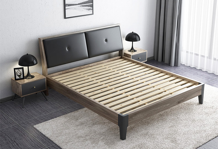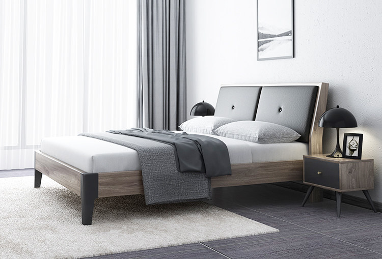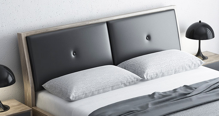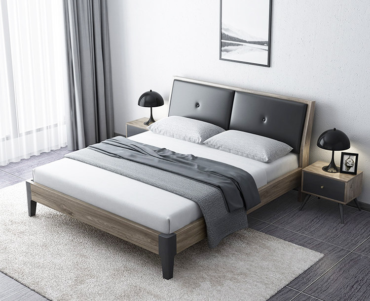 这是一款北欧风简约双人床,外型简练利落,线条流畅美观,没有过多的修饰,不占用多余的空间,非常适合小卧室使用,摆放更加灵活。它以木纹灰与黑色为主色调,沉稳大气,冷静优雅,简洁的软靠设计,平整硬朗,选用舒适的皮艺制作,搭配木纹板材的框架,结实稳固,简约不单调,时尚不张扬,优雅大气。