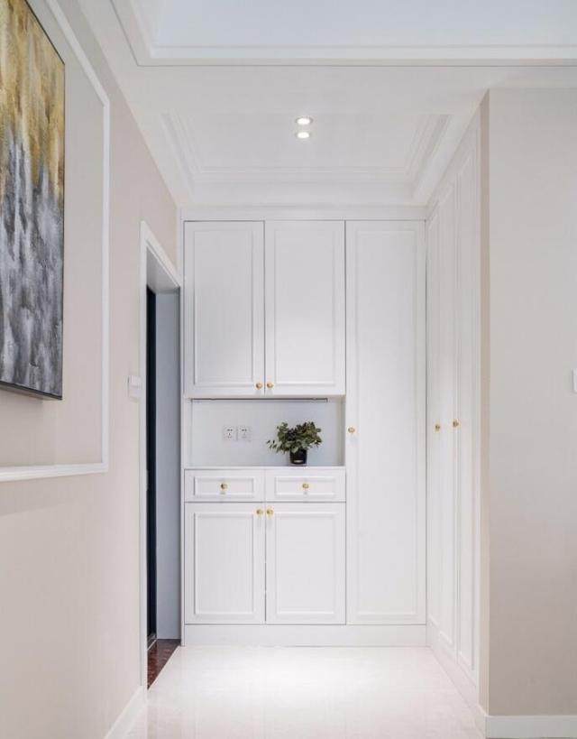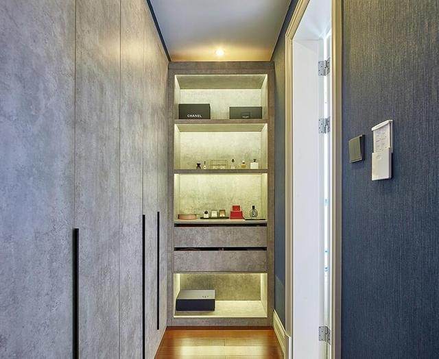 家里有长走廊其实是最不划算的一种房型。因为这些区域除了供家人活动以外没有任何功能。所以为了增加空间的利用性我们可以将走廊的尽头做一个衣帽柜。或者是将两边的非承重墙凿掉,然后做一些定制柜体,这样整个走廊就成了一个收纳衣物的空间。而且两侧门板的设计还会让走廊显得更漂亮。