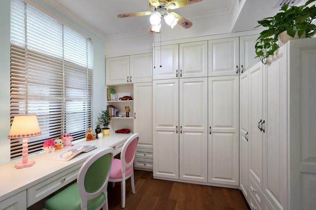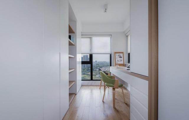 要想更极致的利用空间最好的方式就是将一个空间重复利用。赋予它更多的功能性。而书房作为家里利用率很普通的一个房间,如果单单只作办公和学习确实显得有些浪费。不如打一些大柜子做成衣帽间,这样不用的时候还可以做收纳。