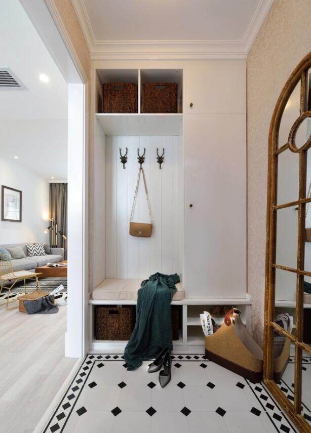 一进门的位置我们也不要忽视了。除了放一个鞋柜其实还可以多做一些柜子。这样出入常穿的大衣、外套等都能放到这里。或者如果你不喜欢封闭式的设计也可以做成这种开放式的。安装一些挂钩放置常穿的衣物出入穿脱也更方便。