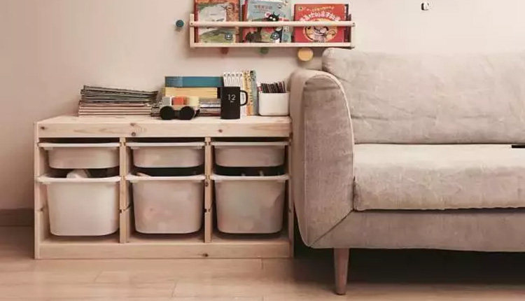 除了边几,还可以在沙发旁边放个置物架,底层可以收纳玩具、各种杂物,而台面用来收纳平时常用的物品。