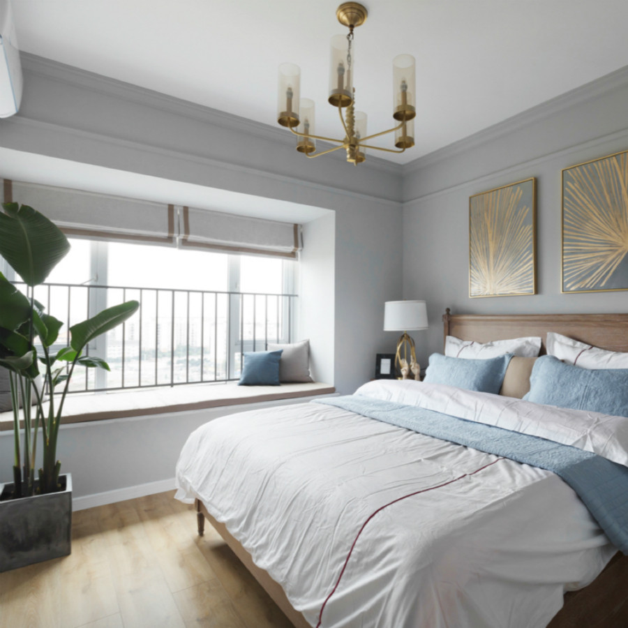 主卧的地板跟客厅的地板都一样,采用原木色的,这样就给了我们美式风的感觉,搭配上高大的绿色植物,整体的感觉非常的nice。