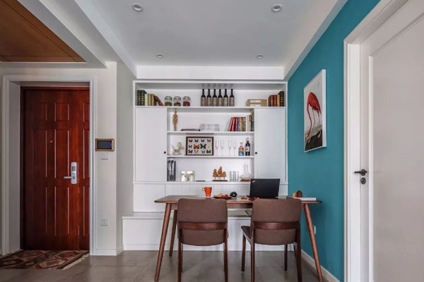 它可以有效节省空间,即使家里没有独立的空间,它也可很适合的。它作为餐厅背景墙的设计,也有相当强大的收纳功能,真的不容小觑哦!