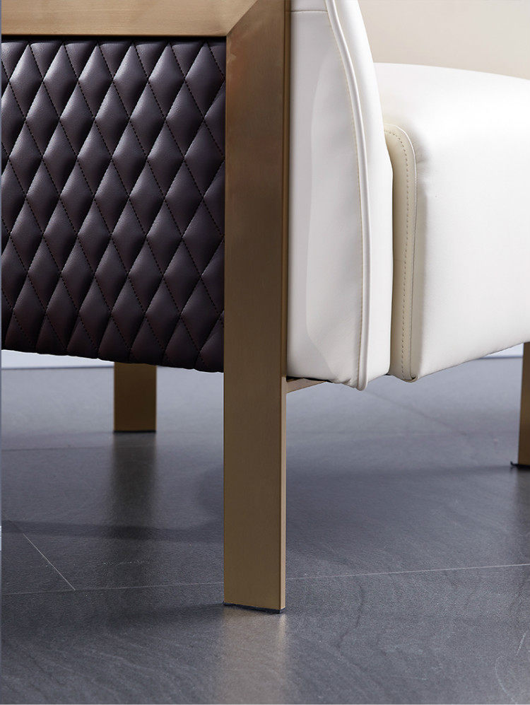 采用精致美观的全金属框架,金属的底座,时髦而又很吸睛,采用不锈钢的框架承托,亮金的色泽尽显轻奢质感,质感强烈且承重力极强,打造出舒适的使用感受。高端金色的搭配给您视觉上的享受,灵动的颜色和明亮的金属椅脚,演绎着低调的轻奢,彰显出都市时尚的生活品味。