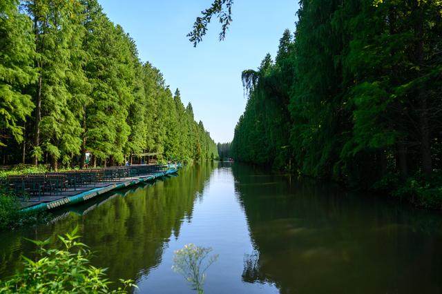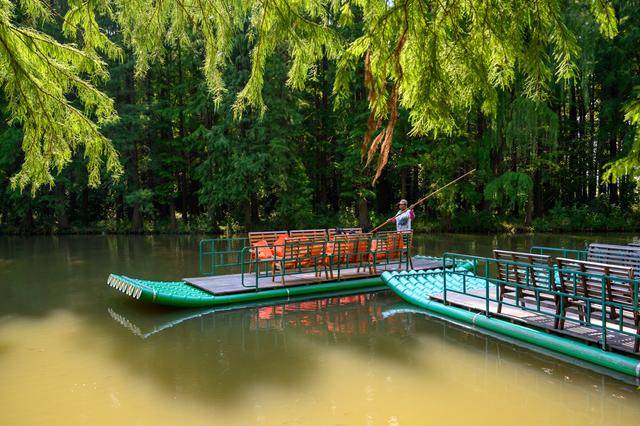 如果置身于池杉林中,走在3000多米的木栈道上没有切身的感受这片森林的独到之处的话,那么就要坐一下水上森林的竹筏漂流了。
