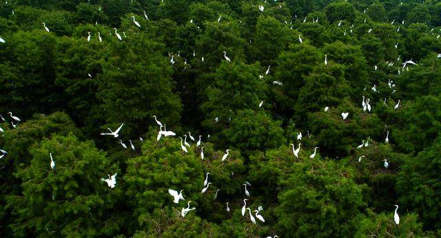 这个森林公园就宛如一块宝玉镶在了高邮湖的边上,这里独特的环境与气候,成为了鸟类的天堂。无论是林间还是枝头,都能看见大批的候鸟在此栖息,在这些候鸟之中数量最庞大的当属白鹭。天然的湿地还给这些鸟儿们提供了足够丰富的食物。