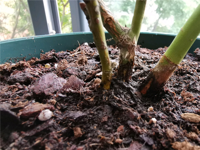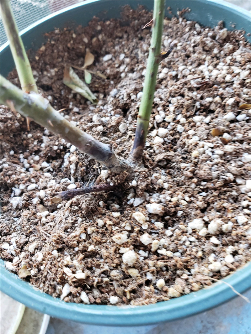 而在夏秋过渡期,月季最容易感染黑杆的位置就是——盆土表面往上5cm左右的的基部枝干。
