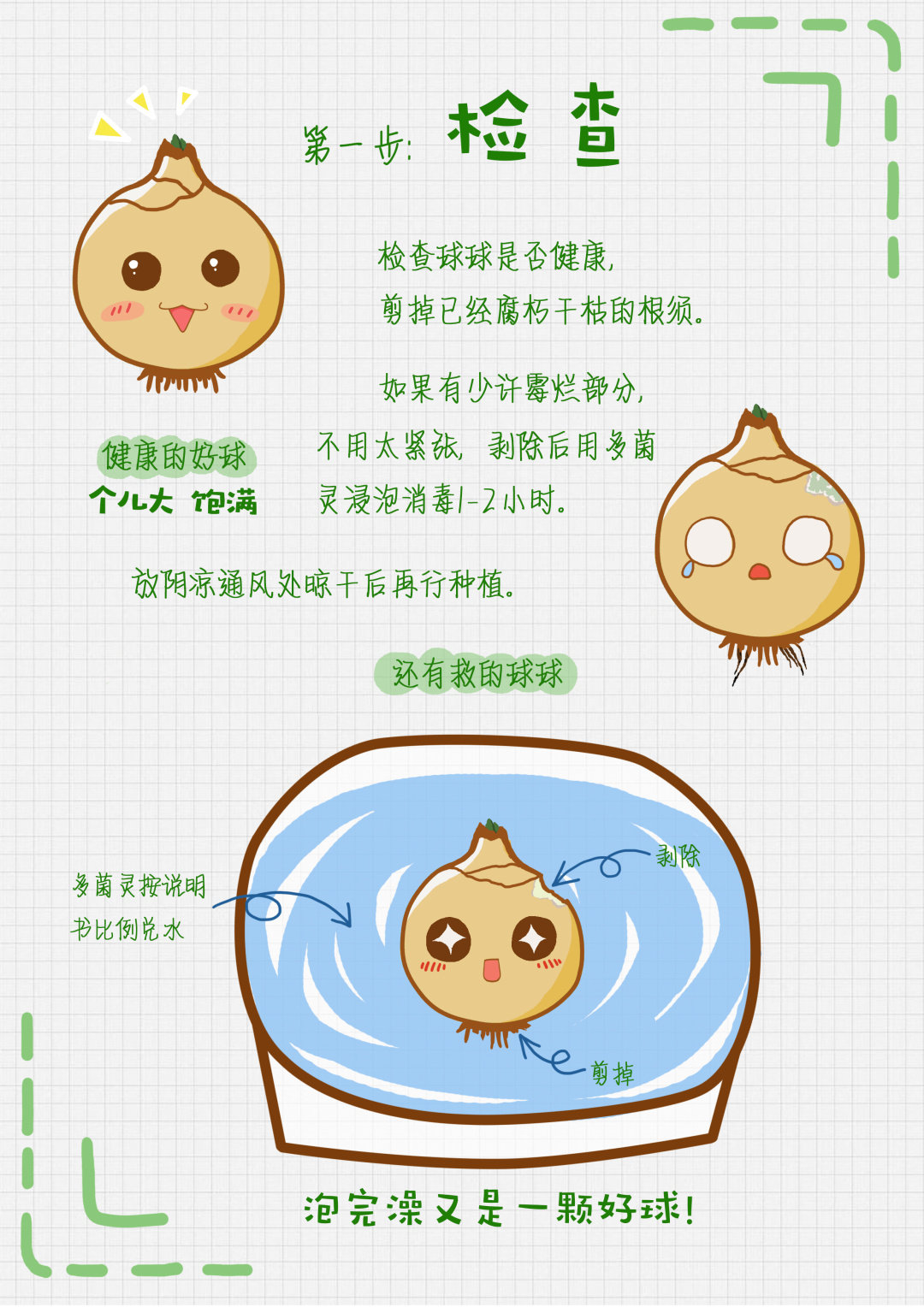检查球球是否健康,剪掉已经腐朽干枯的根须,如果有少许霉烂部分,不用太紧张,剥除后用多菌灵浸泡消毒1-2小时,放阴凉通风处晾干后再行种植。