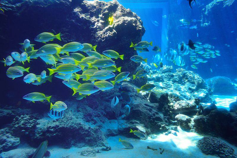 这里的水槽顶部是没有屋顶的,所以太阳的自然光可以直接照进水里,天气晴朗的时候可以看到很多折射的光柱,让这个海底世界更漂亮!