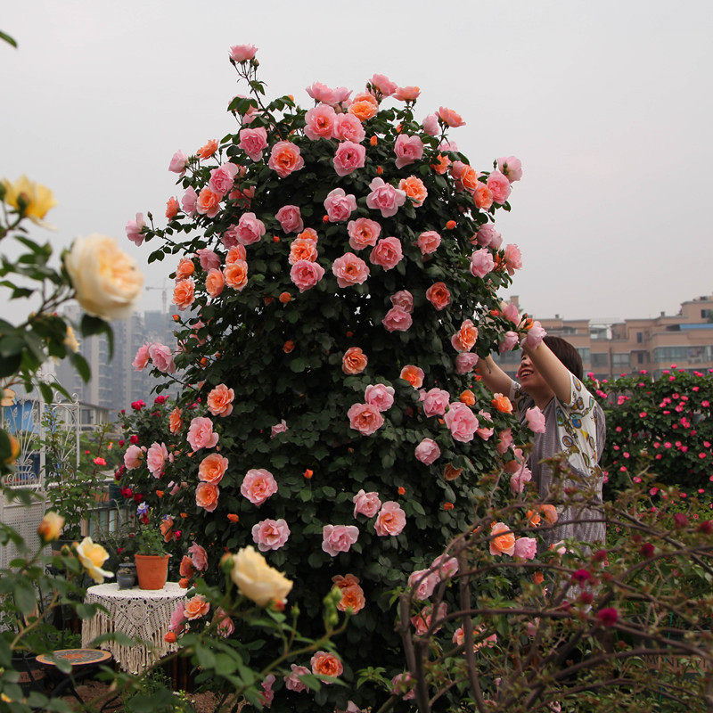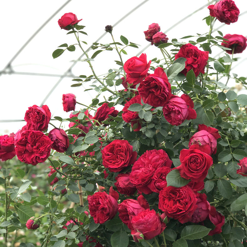 共同的优点:长势强健,丰花。这些月季枝条可以长达2-6米,一株藤月小苗只需要3年的时间就可以覆盖满5平方米左右的花墙,通过合理的修剪、牵引以及水肥管理,在春季时这些月季花墙和拱门的花量会非常壮观。