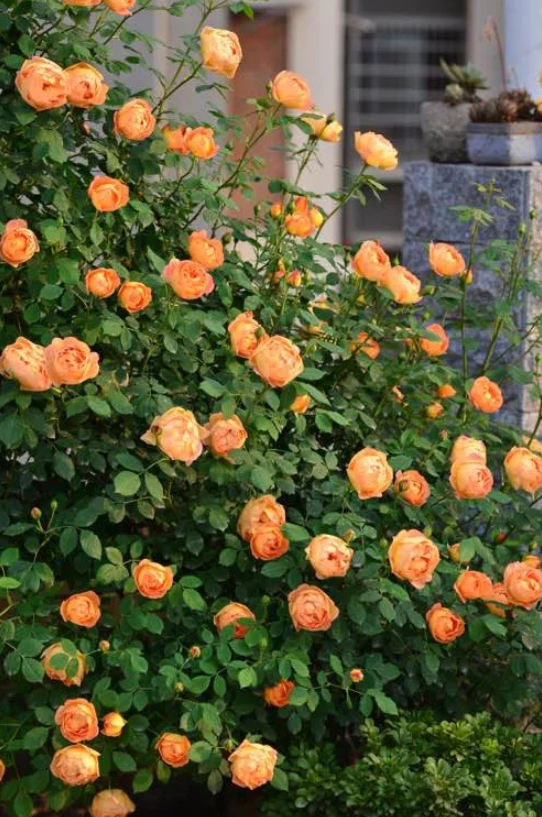 大游行因其生长速度快而成为众多月季迷的喜爱。一般一株大游行三年左右左右能够爬满十来平方的花墙,而且它的花也特别的大特别的多,也是必入的品种之一。
