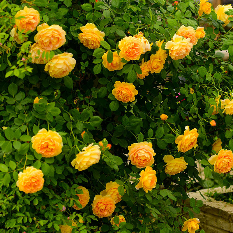 黄金庆典结合了古典月季的香味浓郁以及现代月季的浪漫,可以说是最受欢迎的藤本月季品种之一。用大卫奥斯汀的话来说,黄金庆典是英国月季中花朵最大的,具有甜美的金色而且还不会褪色,花瓣向内弯曲成一个优雅的效果,花量非常大。它格外的香,散发出一种令人陶醉的香味,在藤本月季中也是属一属二的。