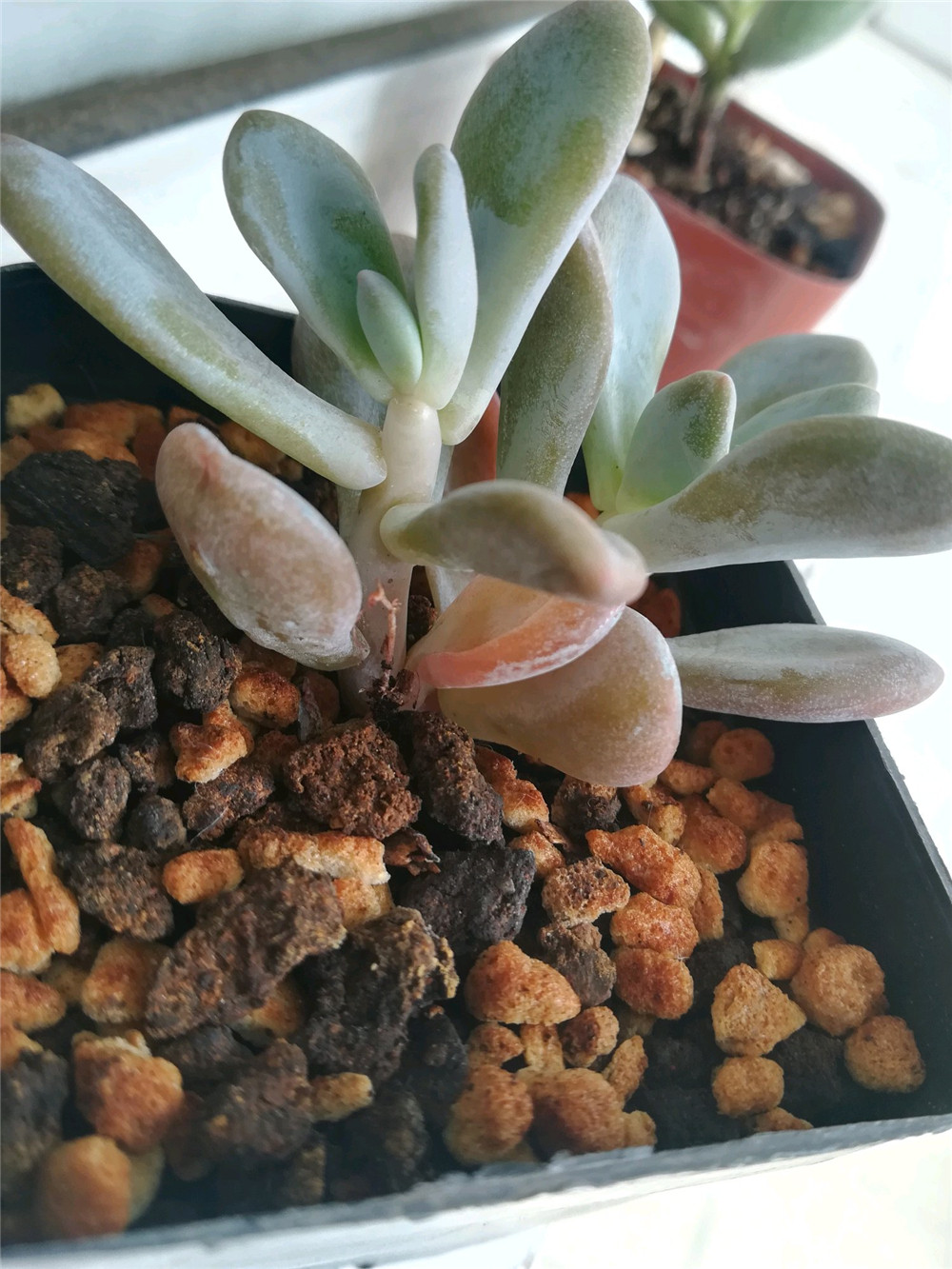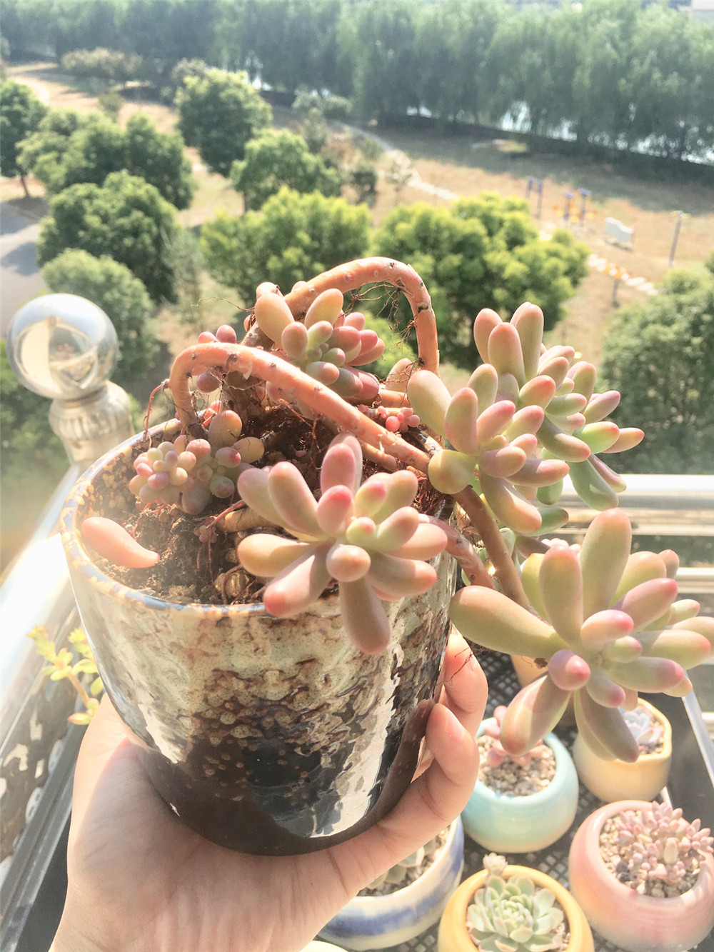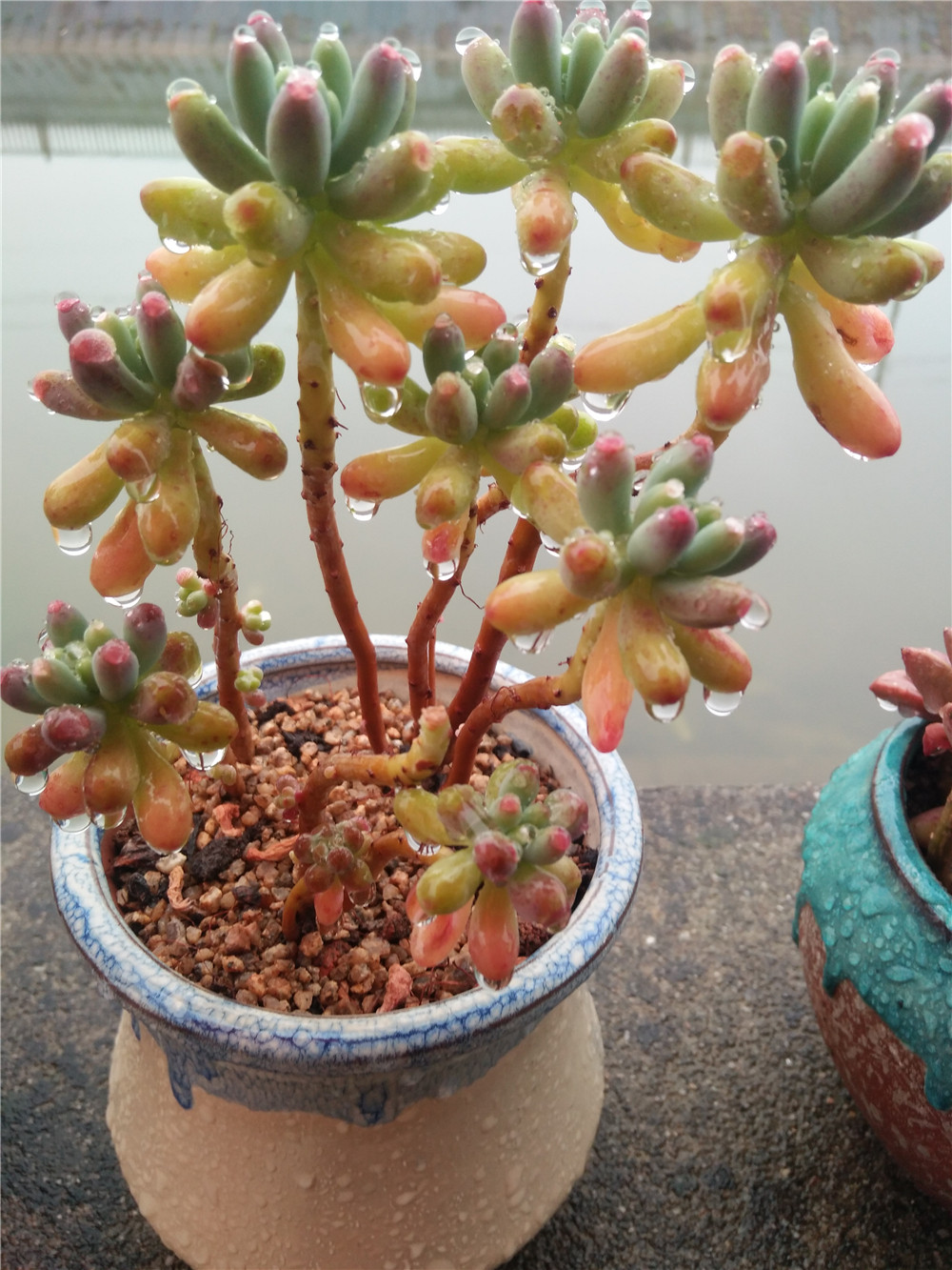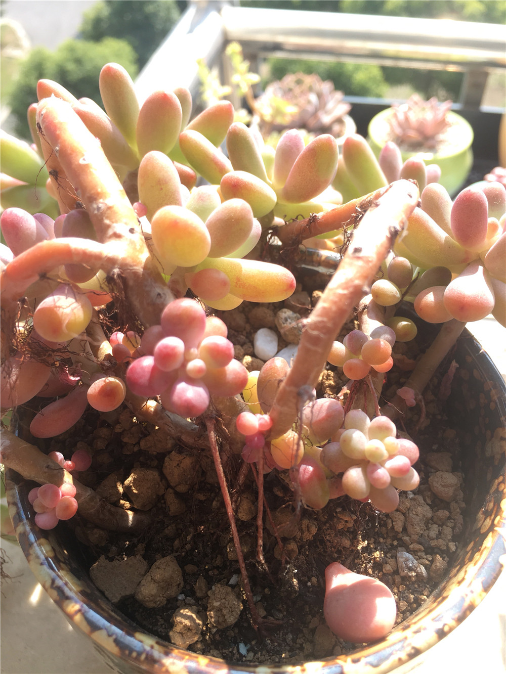 舍友路过一盆多肉的时候,发现多肉叶子上面有奇妙的变化。第一眼看过去就像晒出了果冻色,舍友欣喜若狂!是多么令人开心的一件事啊。等他想靠近这很多要继续欣赏的时候,只有几片透出了果冻色。大部分叶片还是原来的样子,所以感到非常的疑惑,连忙拿手机出来。把这款多肉拍下来,发到微信发给我。我其实受到短信的时候,还在上班,趁着领导还没过来的时候。偷偷打开了信息看,这哪里是果冻色的,明明就是化水的叶子。我边解释给舍友听。