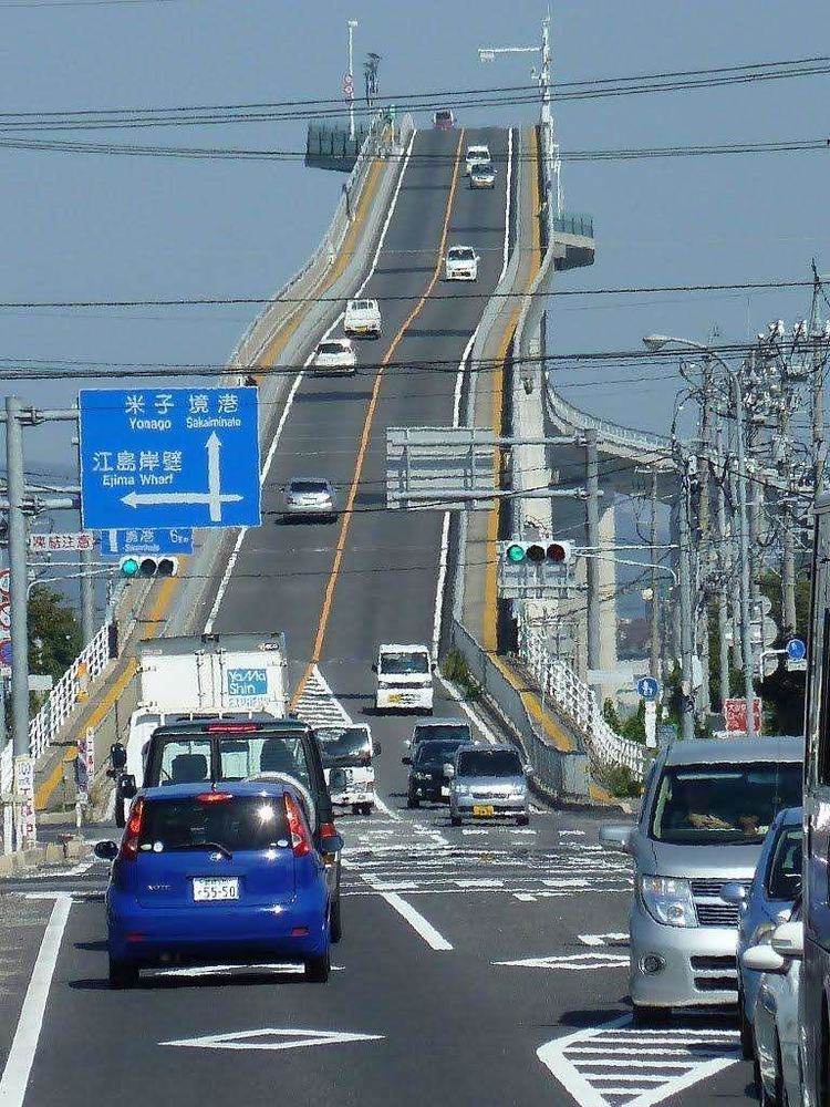 日本江岛大桥连结日本鸟取县境港市和松江市,全长约1446米,高约44米,桥下可供5000吨级的轮船通过。松江市一侧的坡度为6.1%,每前进100米升高约6米。