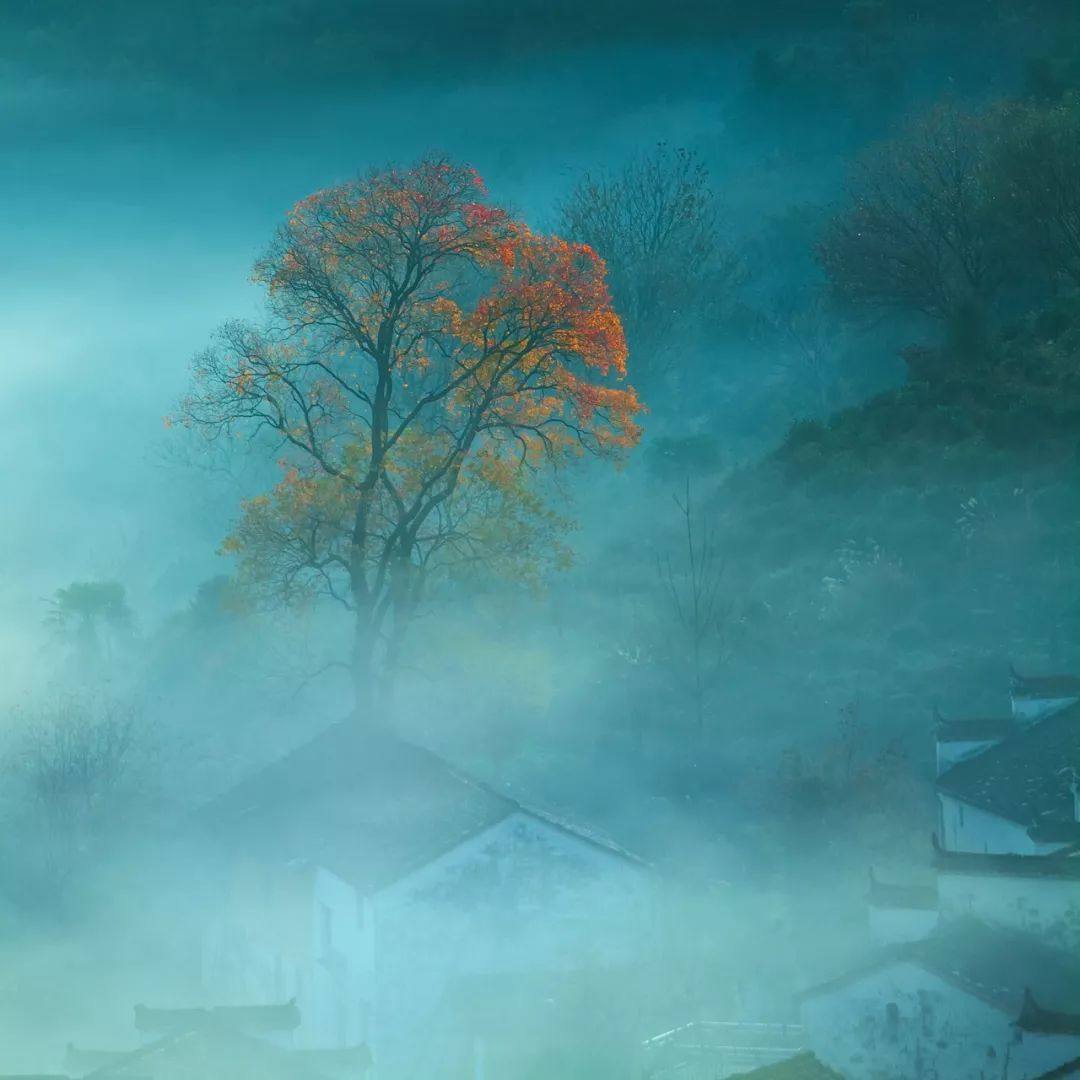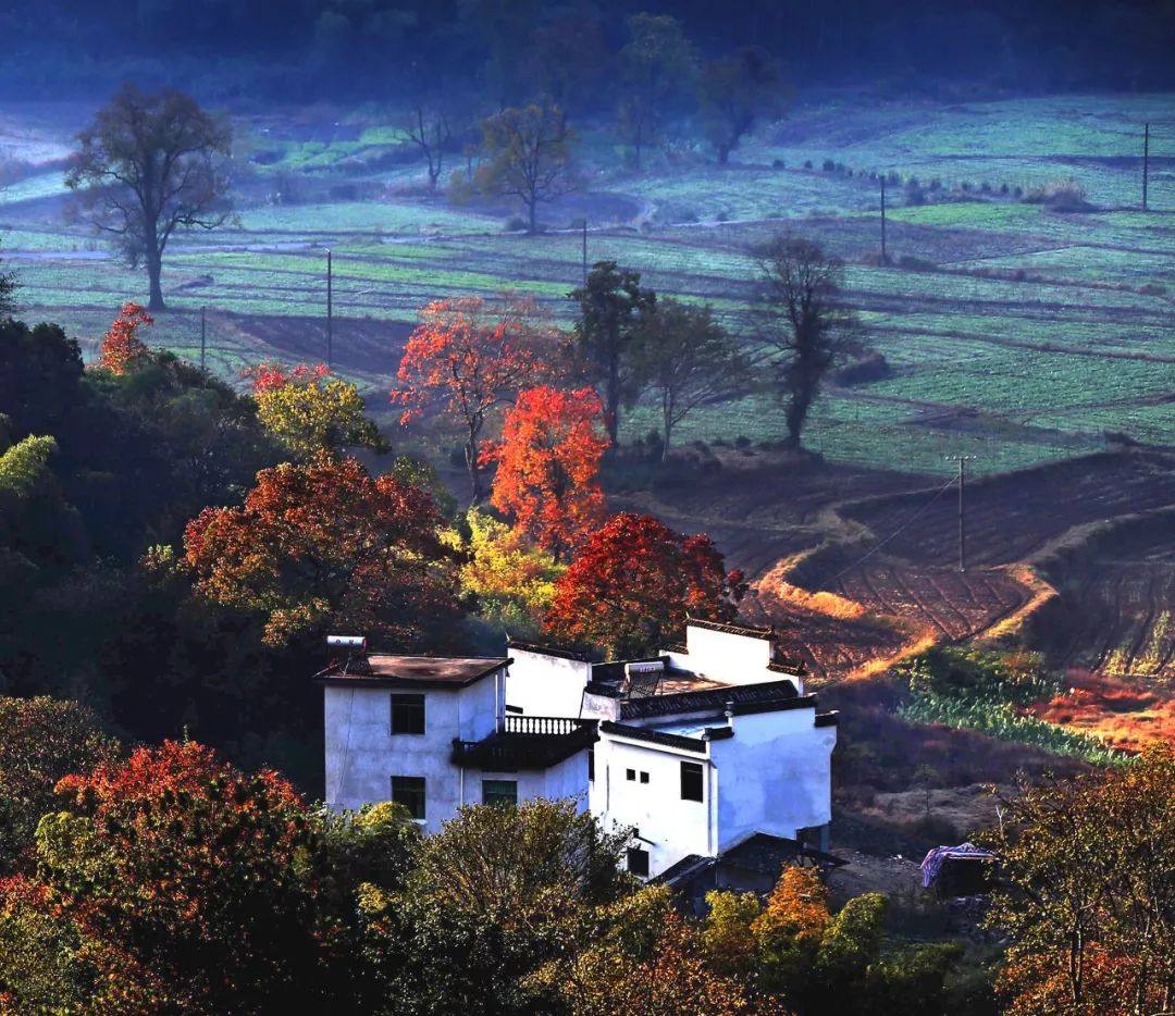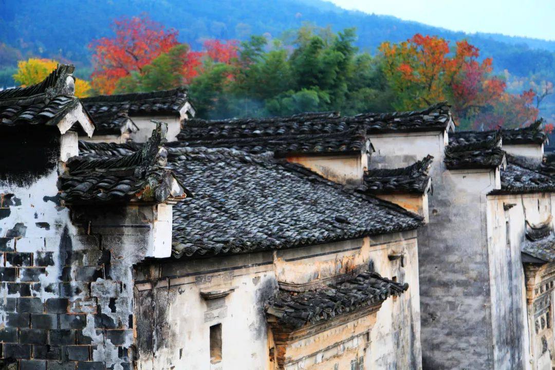 粉墙黛瓦的古徽州民居与傲立古枫交相辉映,犹如一幅梦境深远的山水图画,分外妖娆。