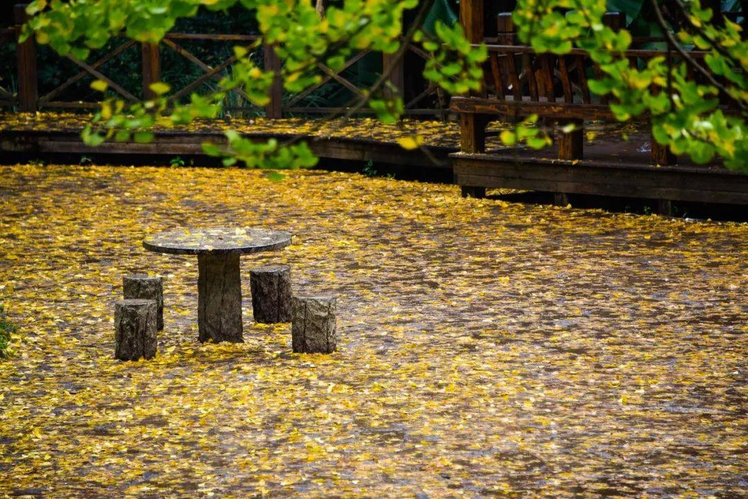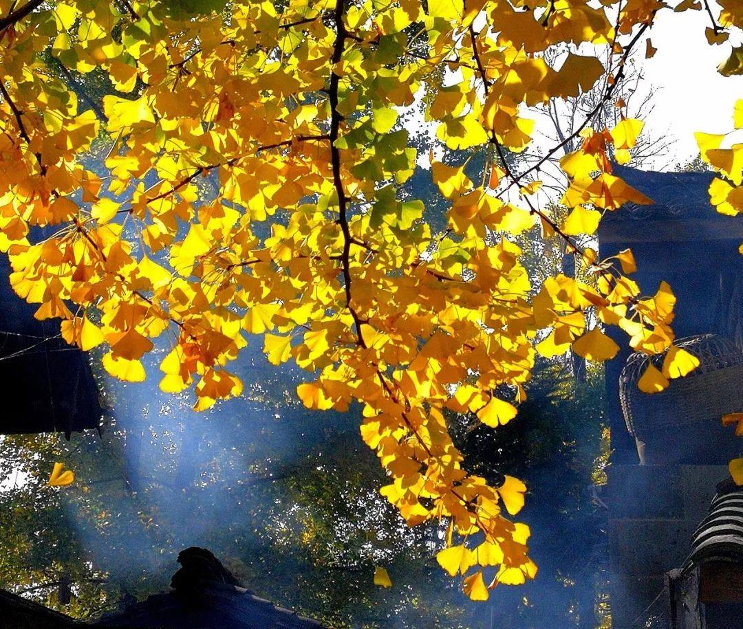 这里的银杏树有声有息,隐于群山环抱,现于农庄炊烟之间,风吹过处,黄叶飘洒,美得象一幅油画。