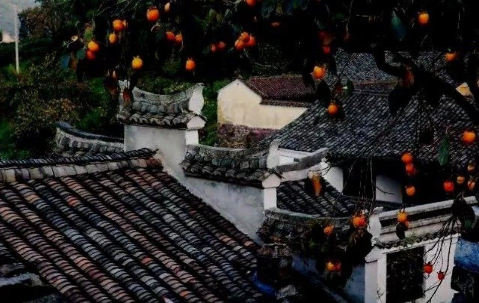 古色古香的粉墙黛瓦之上,小柿子一盏盏红灯笼似地覆盖,红彤彤的,喜气洋洋,怎么看都是一卷独特的山乡风情图。