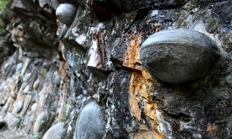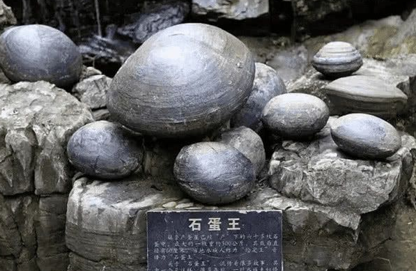 走进一看,崖壁上镶着大大小小数十颗青褐色的“石蛋”。这些“石蛋”质地坚硬且光滑,形态并不规则,在“石蛋”上还有许多如同树桩年轮般的纹路。