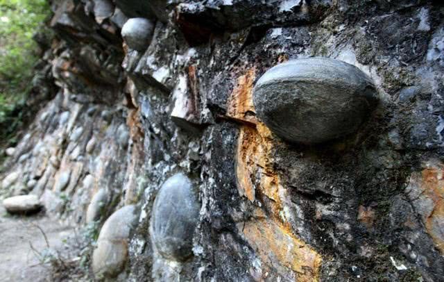 根据当地老人讲述,这些“石蛋”每30年便会从上面脱落一枚,好似悬崖生蛋,故而得名产蛋崖。在村子里,至今保存着产蛋崖“生”下的68枚石蛋,最大的重约500余斤,被称为石蛋王。
