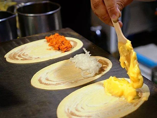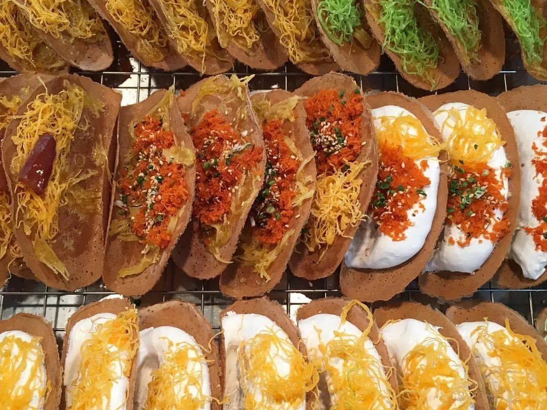 煎饼(Khanom Buang)是泰国常见街边小吃的一种,也是泰国传统甜点的代表作之一。Khanom Buang饼面上会涂抹一层奶油,一般加上鸡蛋、椰丝、甜南瓜、葡萄干等馅料,也可放置自己喜欢的咸味馅料,两头一夹即可食用。饼皮的脆和馅料的松软,为口感上增加了许多层次感,怎一个nice了得。