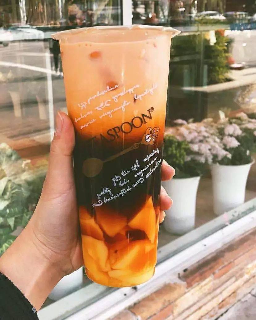 泰式奶茶在泰语叫ชาเย็น,是泰国人最喜欢的饮品之一。正宗的泰式奶茶使用的是深度烘焙的红茶制作而成,加入八角、罗望子以及其他香料熬煮,最终形成红橙色的奶茶,喝到嘴里是泰国茶叶的香气,甜味则是除来源于添加的糖和炼乳, 无论是豪华酒店、网红餐厅、还是路边摊,其菜单里一定有泰式奶茶的位置。