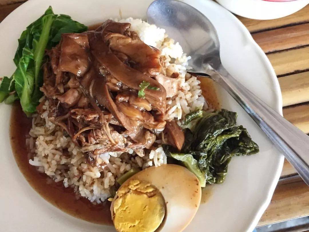 猪脚饭(ข้าวขาหมู)也是泰国当地居民喜欢的日常美食之一,经常会作为早餐和夜宵来吃,路边的小摊就可以吃到很正宗的猪脚饭,价格也十分亲民。煮至香气四溢的猪脚肉配上Q弹的白米饭,配料的酸菜、青菜、卤蛋、辣椒酱、泰国辣椒酱等中和了油腻感,可以说是非常有灵魂的猪脚饭了,吃之前记得擦一擦自己口水。