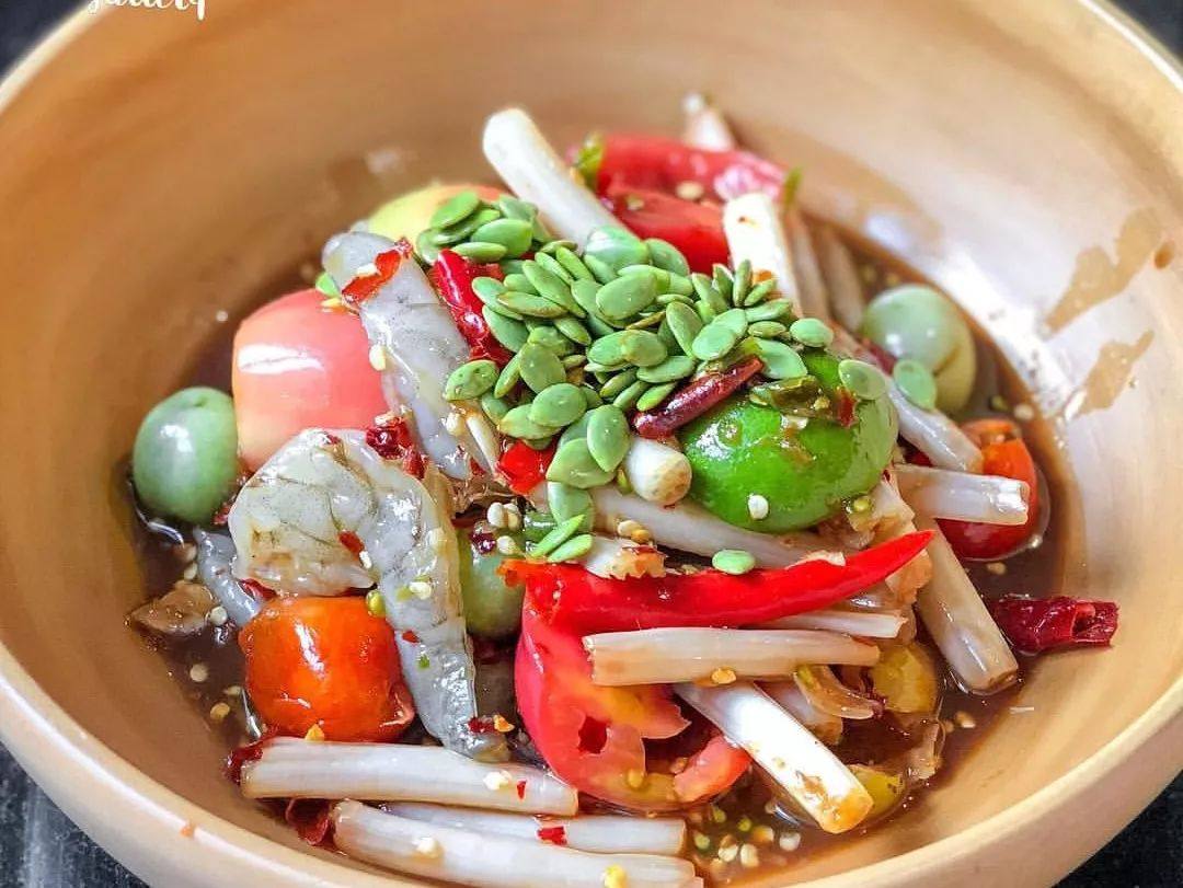 青木瓜沙拉是泰国当地人非常喜欢的特色小吃,一般会配上糯米饭来吃,选用青木瓜和胡萝卜作主料,配上长杠豆、蒜头、虾米、西红柿、椰糖、辣椒等,再加入酸子汁及青柠檬汁。香辣而又酸甜,口感相当爽脆,十分开胃,去泰国的小伙伴一定不要错过。