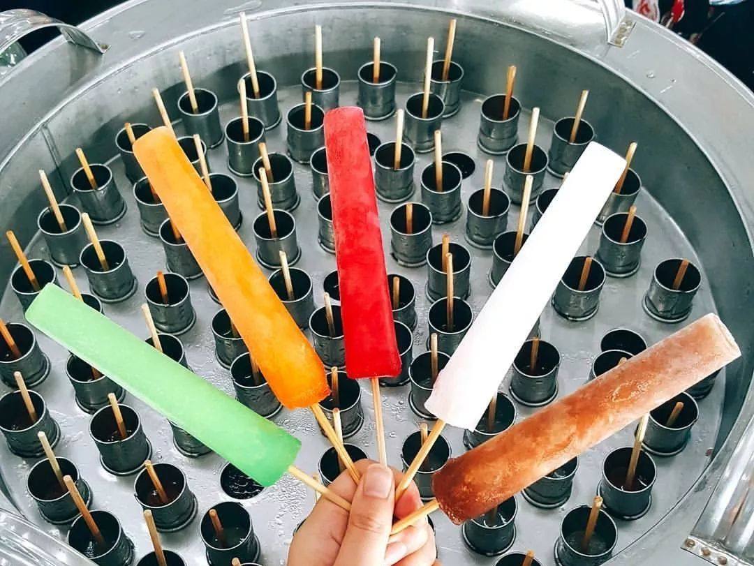 炎热的泰国,怎么能少了“冰棍儿”解暑。泰国街头会有许多小贩推车卖现做的手摇冰棍儿,这种冰棍儿是在完全不插电的环境下,由可乐、芬达、雪碧等五颜六色的饮料二次加工制成。吃起来很普通的棒冰没有太大区别,但因制作材料不同,棒冰的颜色也不同且价格便宜,是泰国街边一大特色。