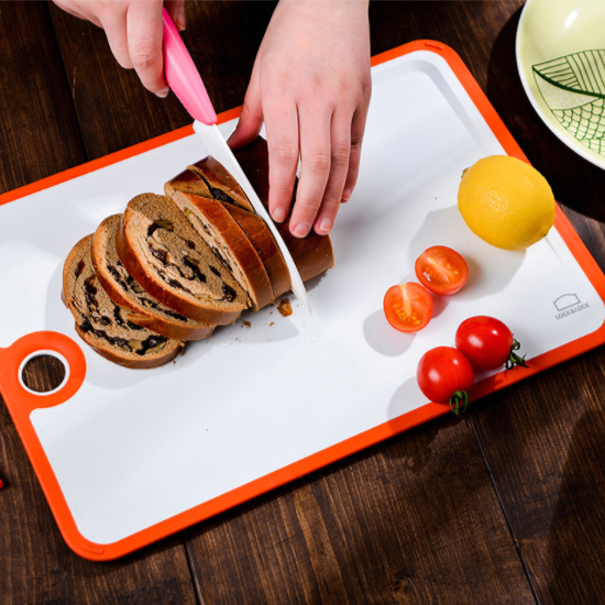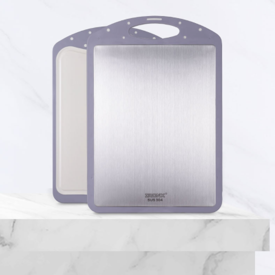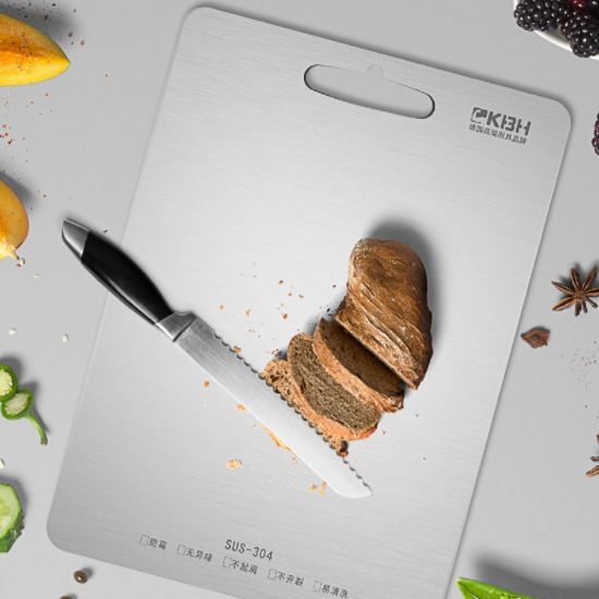 你的健康小卫士,双面切割砧板,一面304不锈钢去腥耐酸易清洗,适合切鱼肉、调味食材及制作西点,一面环保PE板,无胶水异味等,切剁排一面全搞定,用料厚实稳重,使用中不易移位更安全,挂式收纳,即使是狭小空间也能自由出入。