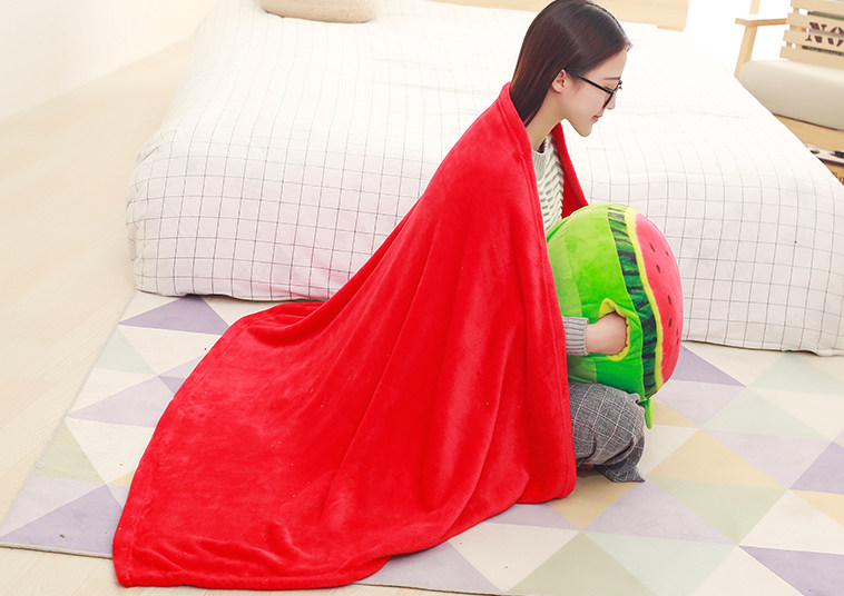 集午睡枕+空调毯+暖手多种功能于一身的抱枕被,强大性能,是居家必备良品哦,精选珊瑚绒面料,绒绒的触感亲肤暖和,不怕着凉,水果图案活性印染不掉色。