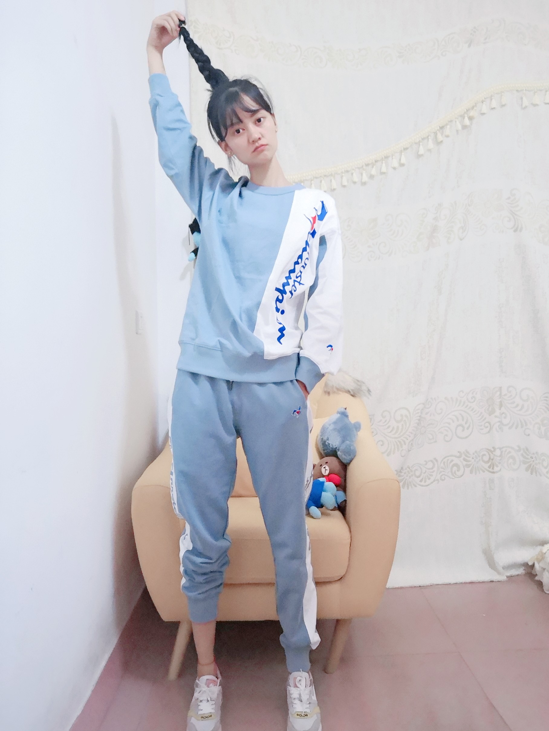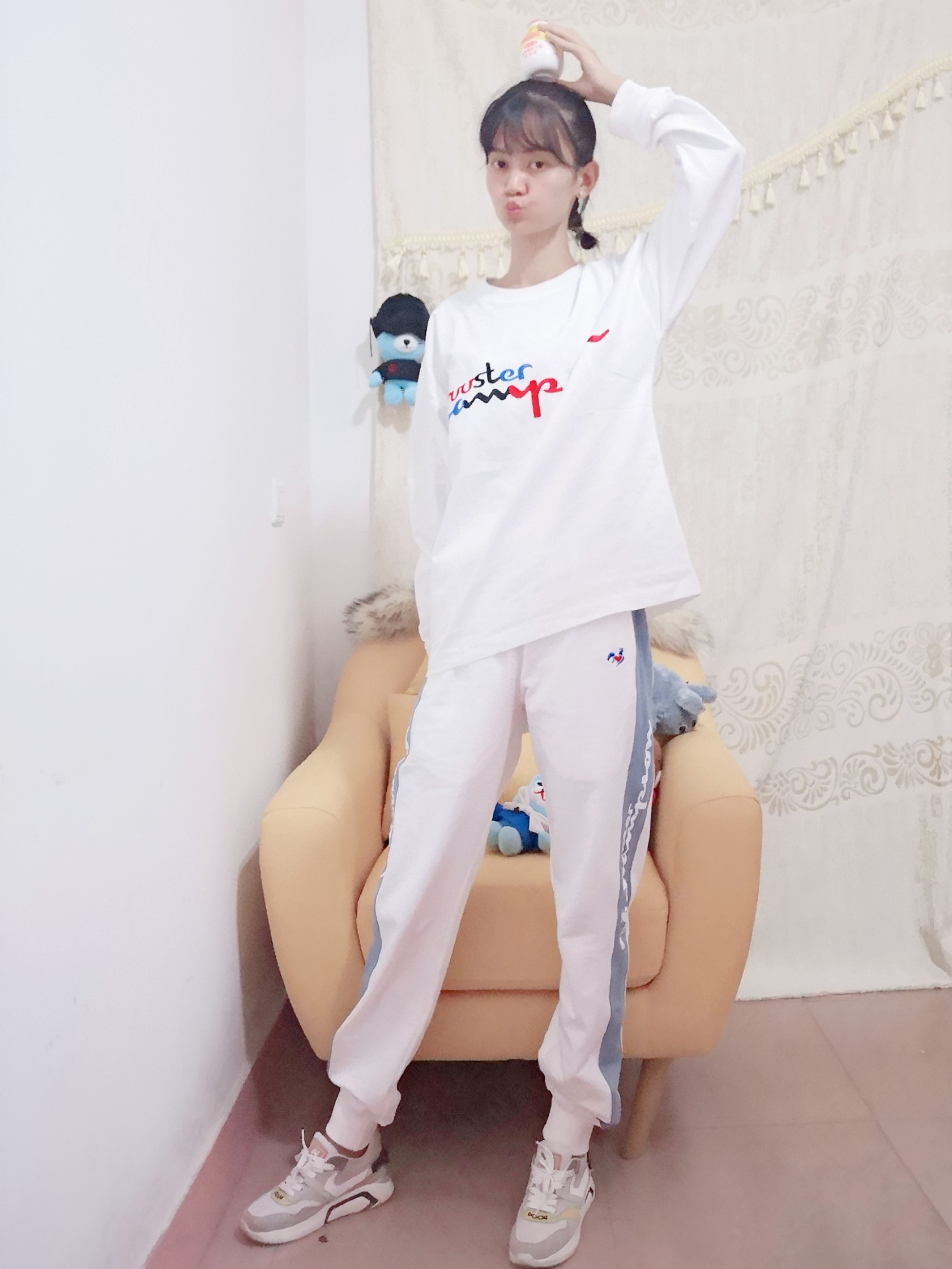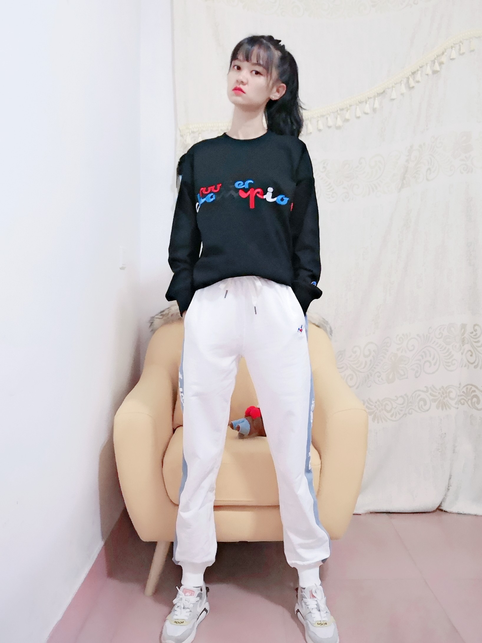秋季节也有很多人始终是黑色的死忠粉,其实白色套装搭配,让你变得有活力起来,学院风的长袖T恤搭配上运动裤,既休闲又不失甜美纯洁感。