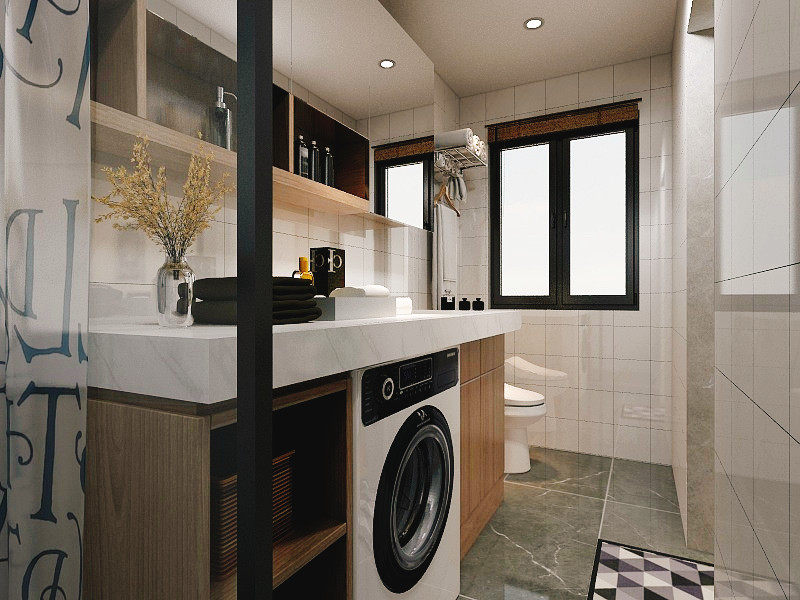 之所以要给卫生间做双重干湿分离,是因为浴室柜和洗衣机都是直接落地的,单单一个玻璃隔断和一个防水条,浅浅洗过几次澡,感觉会有部分的水溅出来,浅浅是很怕到时候影响到浴室柜,所以又给卫生间淋浴区加了一个浴帘,力求不会有一点水溅出来!