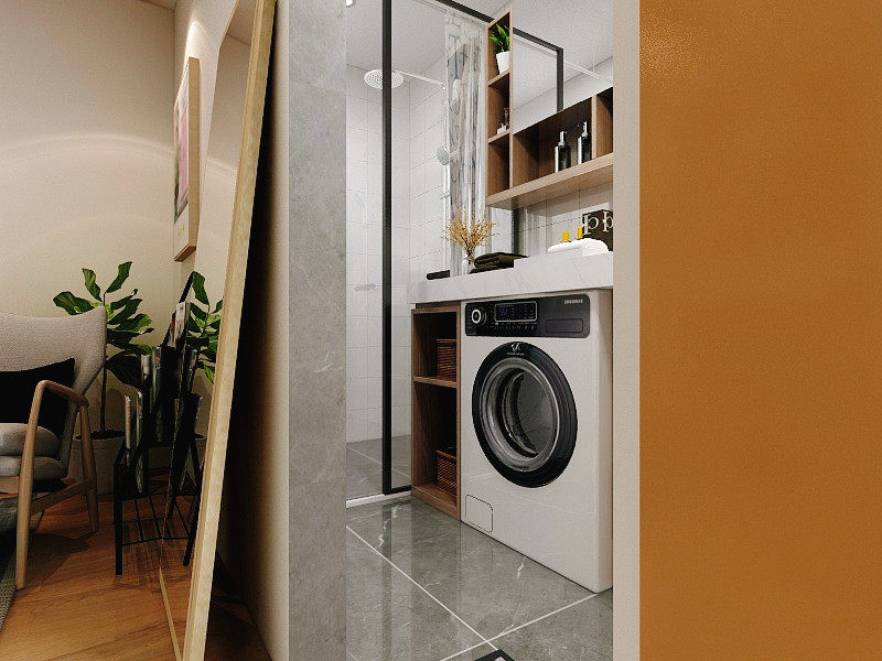 卫生间里面的动线则和一般的一字型动线不同,考虑到门洞的区域,不想直接把马桶对着整个客厅和对面的门,所以选择了把马桶安装在卫生间的最右侧,可以装纳洗衣机的浴室柜放在中间,淋浴区在卫生间最里面,这样就可以避免尴尬了!