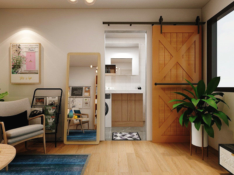 浅浅家的客厅后面就是卫生间,因为开合门不方便的原因,浅浅家用了谷仓门做隔断,开关很方便,而且不占位置!
