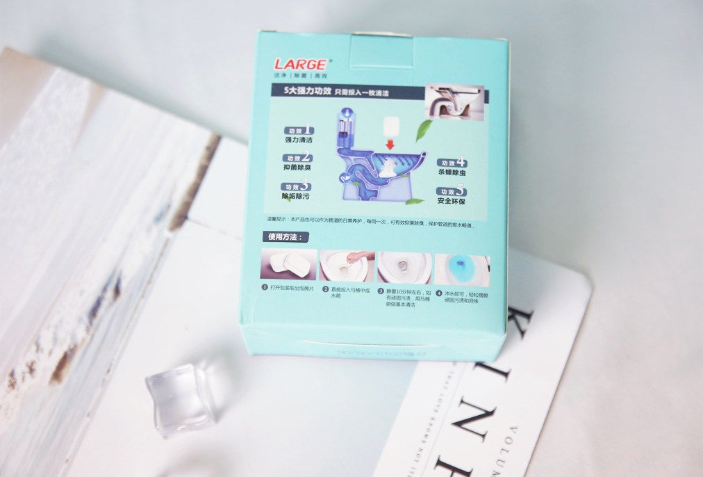 虽然去污效果很强劲,但产品并不含有刺激性的磷等成分,性质温和,不腐蚀釉面,清洁完成会伴随着马桶冲水而完全溶解,频繁使用也不会损伤釉面。使用时取出一片投入马桶或水箱中,静待30分钟左右冲洗即可,使用简单方便。