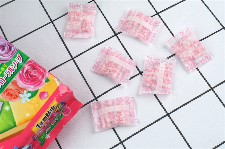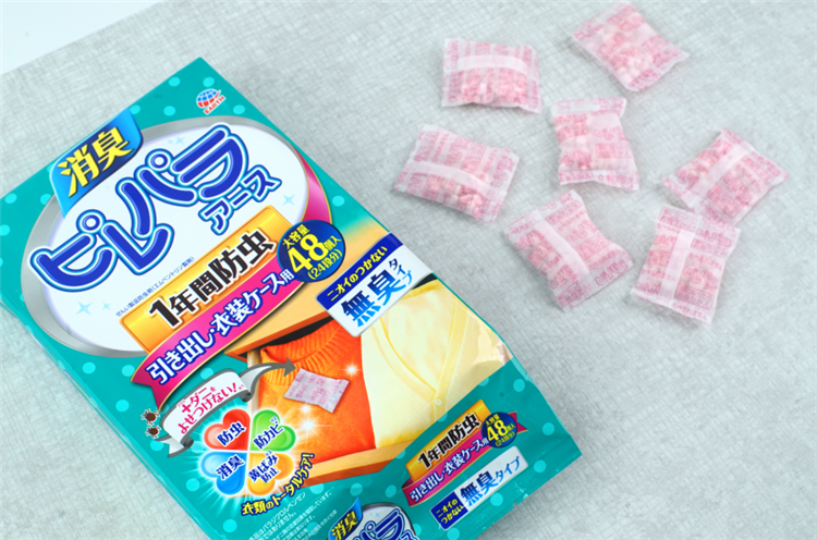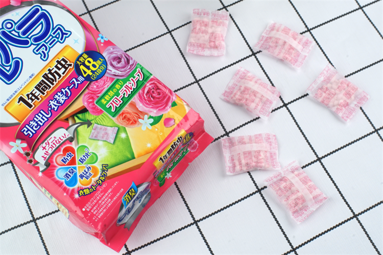 防霉防蛀剂使用起来非常简单,一盒含有48个小袋,使用时将一个从盒子中取出来,然后放置在衣物上方就可以了。防蛀片剂中颗粒的原本颜色是粉色,当变成紫色时,就可以进行更换了,从而保证防蛀效果。一般来说,50L的衣柜抽屉或是衣物收纳箱里放置2-4个其实就足够了。