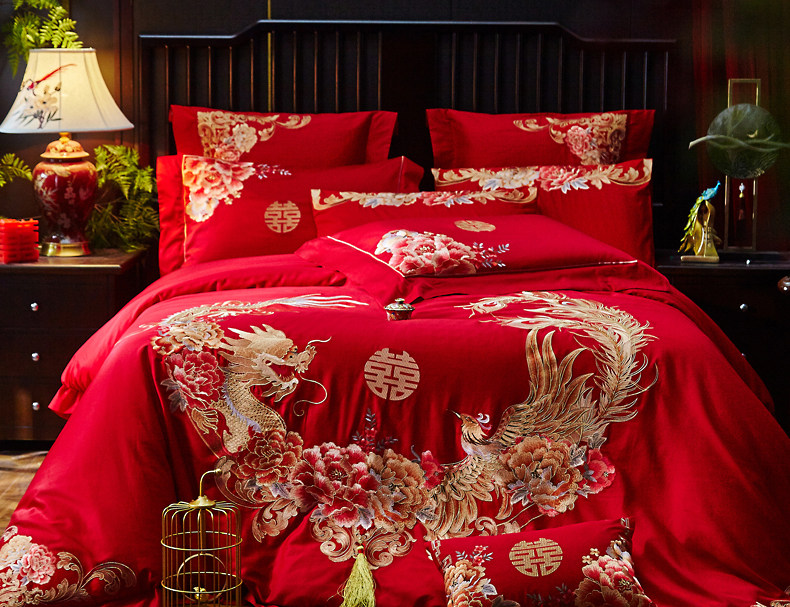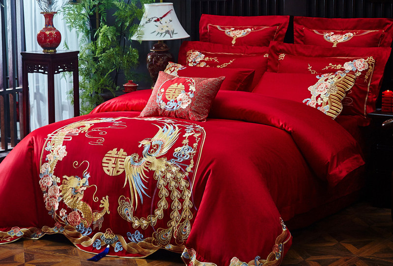 既然是结婚,那么床上用品肯定都要是大红色系列,这样才会有喜庆、红火的感觉。这里的要求会高一些,不仅仅是质量上一定要过关,在图案和整个布局上面都是非常有讲究的。基本上都会是刺绣的装饰,龙凤的图案是必不可少的,还可以加上一些其他的。当然了,如果家里有不一样习俗的就另当别论了。