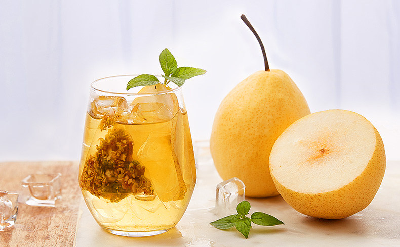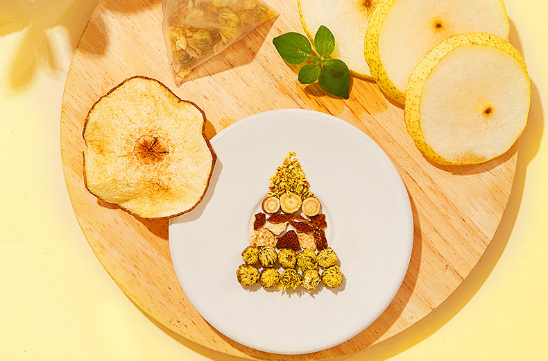 精选嫩白多汁的雪梨、香气悠扬的金桂花、蜜香浓郁的菊花、陈香怡人的橘皮和甜润回甘的甘草制作而成,每一款原料都经过悉心地挑选,秘制比例拼配。