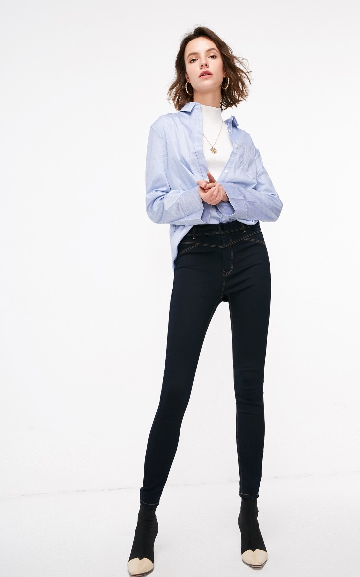 高腰紧身裤的最大特点,就是能展现小个子女生的完美腰线,搭配一条浅色高腰紧身裤,上身可穿藏青或黑色等衬衫,衬衫最好是衬衫领或V领,能整体拉高女生的身高,展现出大气的一面。