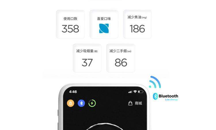 APP拥有对使用口数、喜爱口味、减少焦油、减少吸烟量、减少二手烟、放松时间等六项数据实时监控。让吸烟者可以在手机APP里直观的看到自己每一天的吸烟状况。