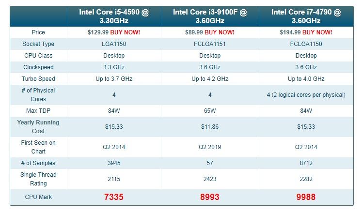 从PassMark的数据中我们可以看出,九代酷睿i3-9100F和曾经的热门处理器四代酷睿i5-4590对比,性能总分有超过20%的提升,和更高一级的四代酷睿i7-4790则是相差不到20%。能做到这样的效果,和i3-9100F的架构有着密不可分的关系。