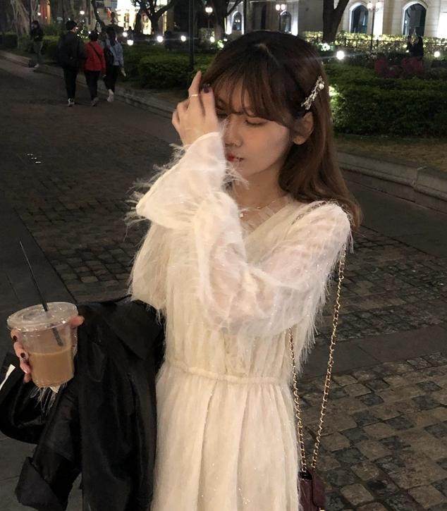 这款连衣裙采用亲肤柔软的雪纺面料,搭配杏白的配色,朦朦胧胧的有些小撩人~面料上还做了狠轻盈的流苏设计,走起路来随风飘摇狠仙狠梦幻。流苏里还夹杂着同样狠轻盈的金丝流苏,又仙又闪耀光线下熠熠生辉。V型领口搭配拼接网纱花边设计,甜美感爆棚。领口处做了隐形的一粒扣设计,方便穿脱的同时不影响美观。高腰线加上松紧腰,轻松拉长下半身比例更显腿长,同时也不挑身材对各路仙女的身材都狠友好哦~