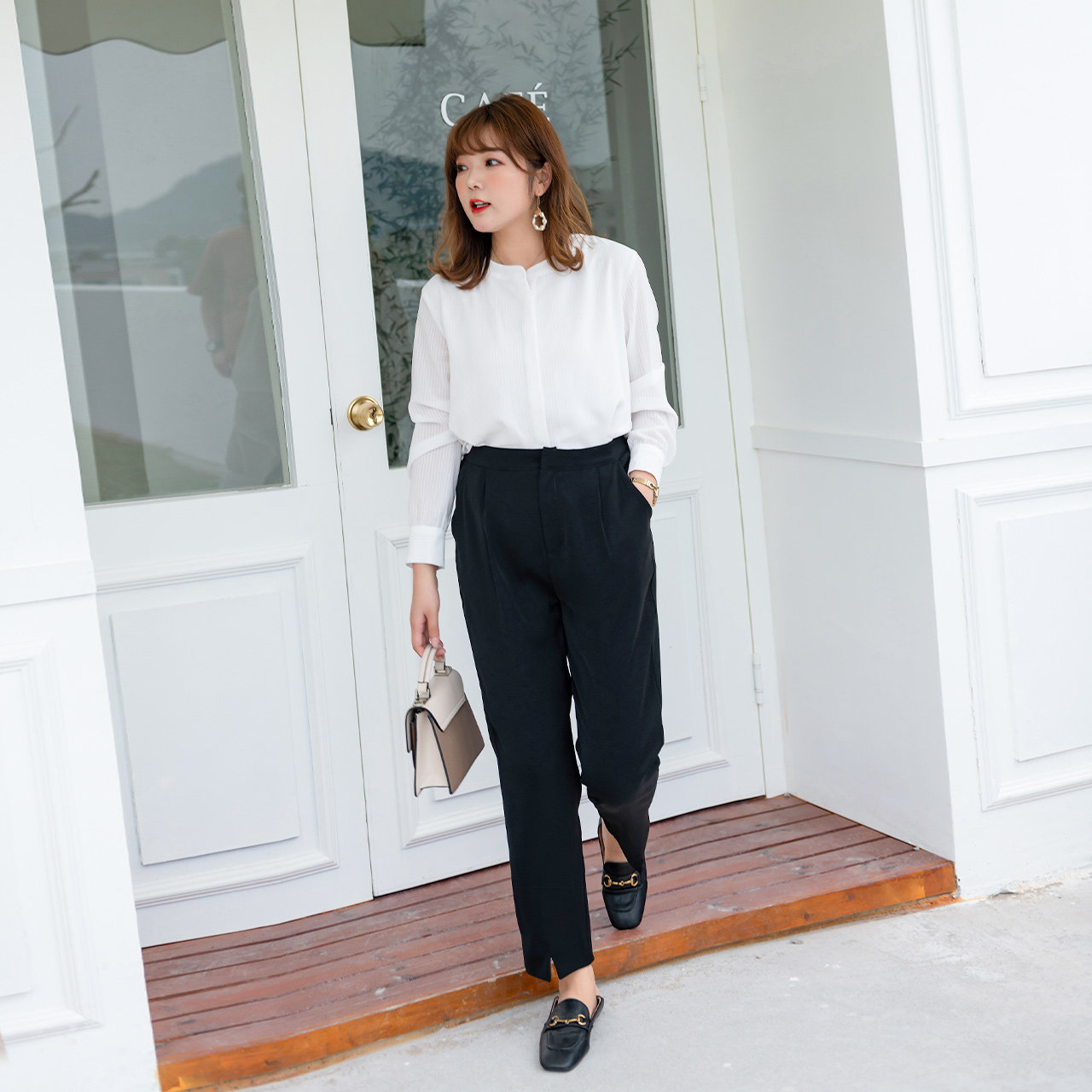 阔腿裤是问题身材的救星,HOLD住各种不完美的腿型,高腰的款式又能束缚收腰,让轻熟风的打扮十分显瘦。聚酯纤维的面料,多了几分摩登的时髦味道。