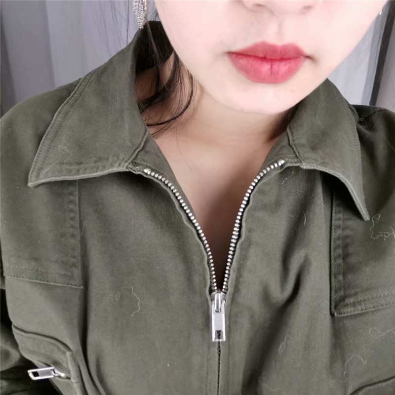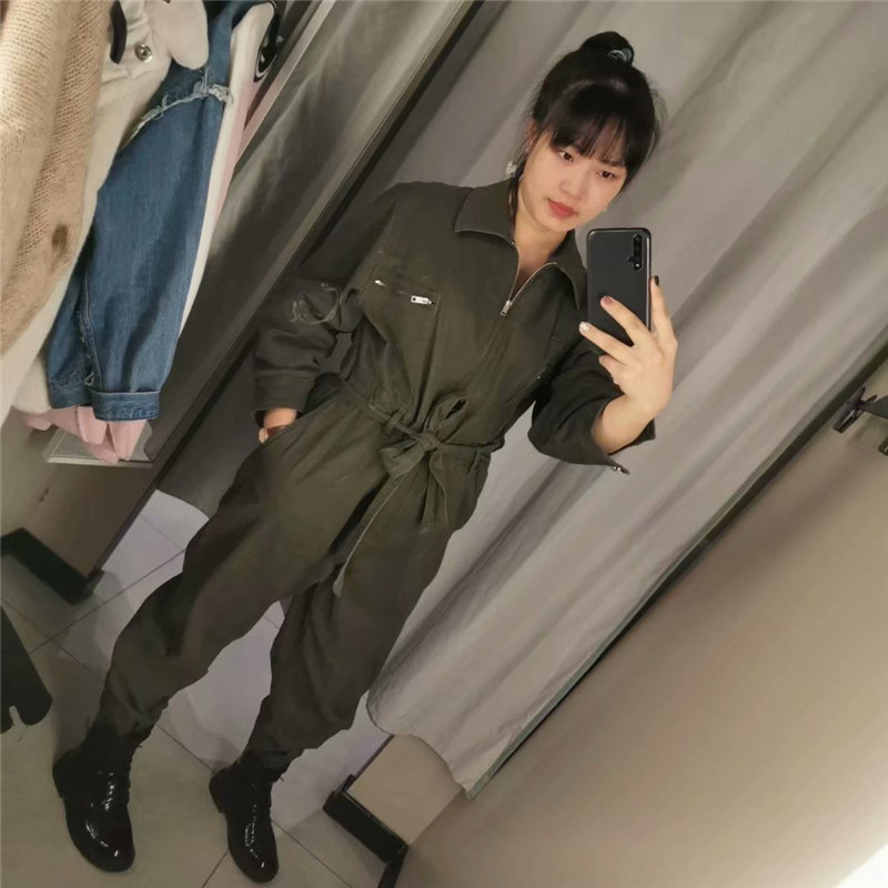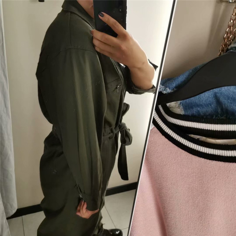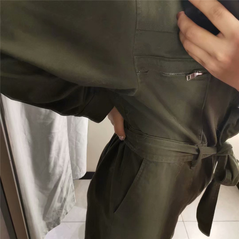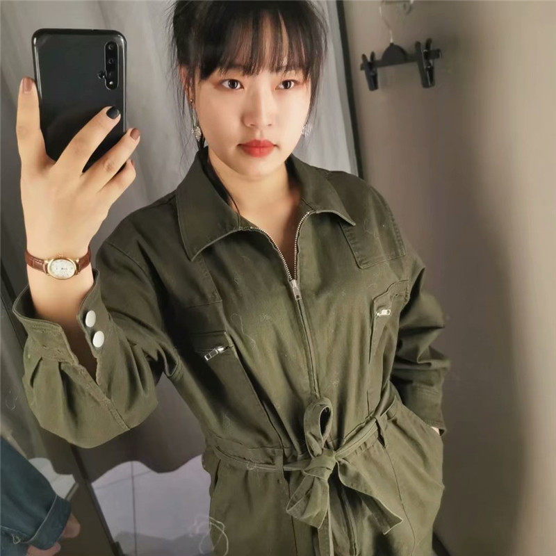 今年非常爆火的工装连衣一体裤,好多明星都穿,大秀街拍机场照都少不了它的影子,非常的帅气。中性风又不失可爱,穿起来真的超级减龄显年轻。真的是谁能不爱呢。这款连衣裤合身版型设计,适合各种身材的美女。穿它上街真的非常的吸睛,给人眼前一亮的潮流时尚感。整体合身的舒适版型,上衣拉链可以方便穿脱,翻领设计更加显脸小显年轻,还可以让颈部看起来更加修长。腰部腰带修饰腰身曲线可自行调节松紧,宽松的裤腿可以很好的遮挡胯宽和腿粗,更好的显瘦。瘦腿的裤脚设计让穿鞋更加舒适还可以很好的防风,显得整体不那么肥大。这款裤子无论高矮胖瘦小个子都可以轻松驾驭。宽松的长袖设计可以很好遮挡手臂上的肉肉还能防晒防风,宽松的裤腿设计让你蹲下去也不会尴尬紧绷不舒适。军绿色的颜色整体看上去工装风的感觉,穿起来非常的帅气干练,穿上它让你比男生还要帅。