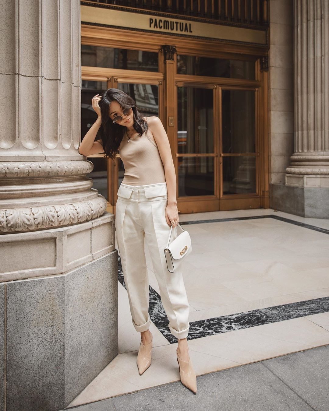 苹果型的身形并不是完全一无是处,苹果型的身形四肢往往都比较纤细,腿部看起来会比较显瘦,所以搭配上不妨尽量的展示下半身,能拉长身材曲线,将优点展现,让视觉留在腿部,自然而然就能忽视腰部的赘肉感了。