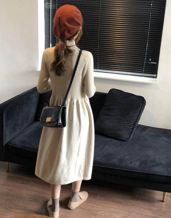 这款气质长裙上半身采用修身的坑条纹版型,包裹身形作为秋冬内搭真的很奈斯,搭配小高领领口设计能够很好防风保暖。秋冬做为内搭露出领口,叠穿的美感就出来啦!A字大裙摆的版型,上身更显减龄和少女感。搭配短款的外套时,露出宽松的大裙摆非常甜美啦~