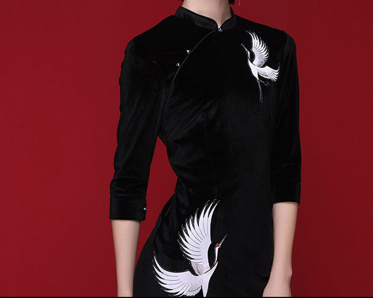 极具东方色彩的中国风仙鹤刺绣图案,是整件裙子的最大亮点。展翅欲飞的仙鹤+经典的黑色绒面料,设计很是别具一格。无论是搭配什么颜色的鞋子,都可轻松穿出高级感。不管是参加聚会,还是上班、日常穿,都毫无压力!